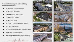 Docieplanie, wymiana okien, a także to, czego zwykle z dołu nie widać, czyli zamontowane na dachach budynków panele fotowoltaiczne… Termomodernizacje kolejnych obiektów planowane są w latach 2025-2027.