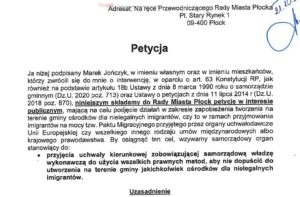 Właśnie do tej petycji nawiązywał Marek Tucholski z Konfederacji w kontekście zapowiedzi powstania Centrum Integracji Cudzoziemców w Płocku. Z kolei prezydent Płocka odbijał piłeczkę, że ta petycja pod względem swojego zakresu nie dotyczy powstania CIC – punktu usługowo-informacyjnego, który ma być częścią Mazowieckiego Centrum Polityki Społecznej. Tak czy inaczej doszło do przygotowania projektu uchwały.