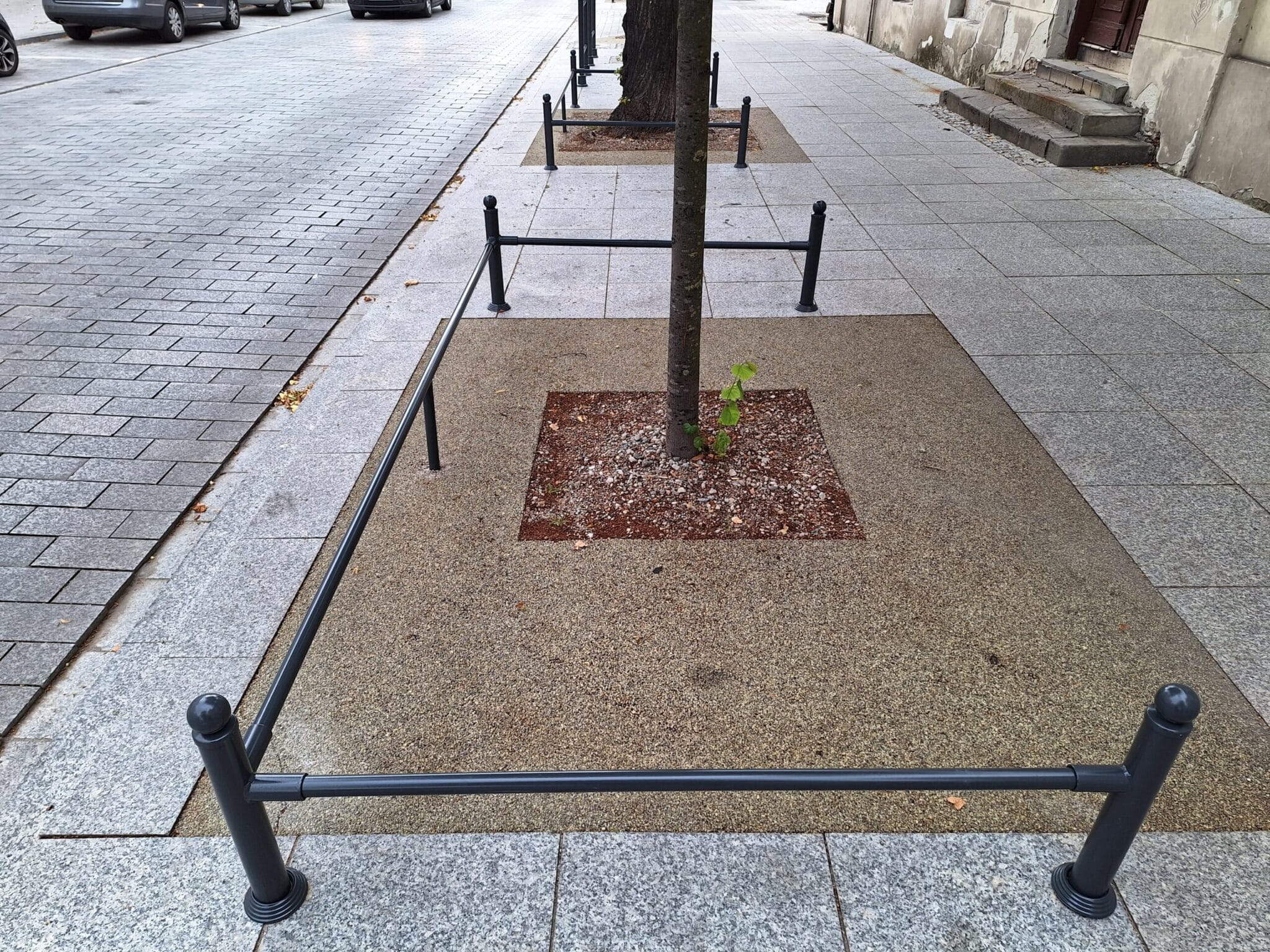 Teraz większość drzew została częściowo ogrodzona, aby kierowcy nie wjeżdżali na nawierzchnie wokół drzew wykonane z wysokoprzepuszczalnej masy, tak by zarazem utwardzić ciągi piesze i zapewnić przenikanie wody do korzeni drzew. Również przed tym samym – kołami aut rozjeżdżającymi kruszywo – mają chronić zamontowane płotki.