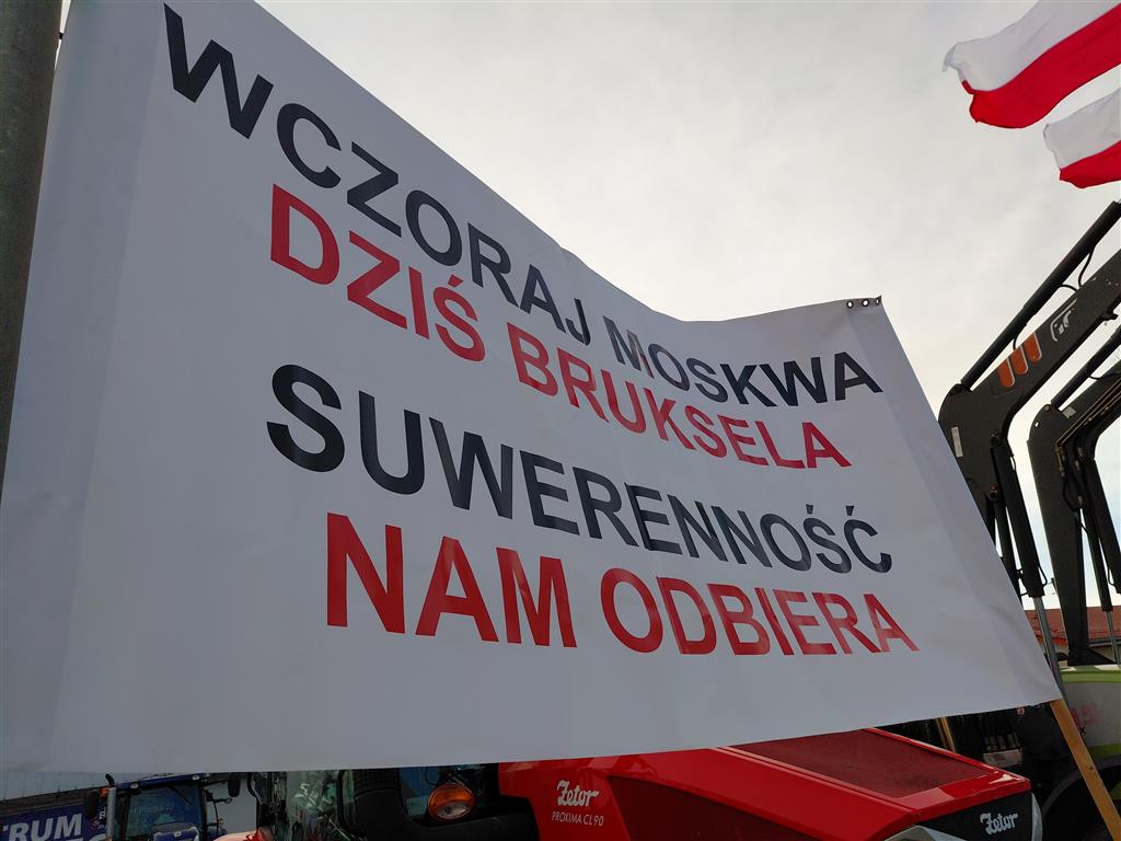 I faktycznie jeżeli protestujący mieli banery, przeważały te z hasłem „Stop UE-Mercosur”. Pojawiły się też inne, np. „Unijna polityka niszczy rolnika”, „Wczoraj Moskwa dziś Bruksela suwerenność nam odbiera”, „Głód poczujesz, rolnika uszanujesz” czy „Bez nas będziecie głodni, nadzy i trzeźwi” – w tym przypadku grafika jednak zwracała uwagę, na banerze bowiem widniały dwie szubienice, a na pętlach autor „zawiesił” flagi ukraińskie.
