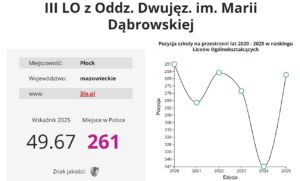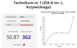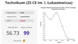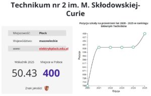 400. miejsce – Elektryk, czyli Technikum nr 2 im. Marii Skłodowskiej Curie z bardzo dużym awansem z 498. miejsca w 2024 r. Mimo wszystko szkoła spadła z drugiego na trzecie miejsce w Płocku.