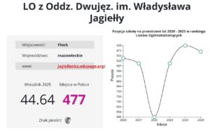 Ostatnie miejsce na podium zestawieniu najlepszych płockich liceów w rankingu miesięcznika „Perspektywy” należy do Jagiellonki, której jednak daleko do Małachowianki i III LO Co więcej, szkoła spadła z 439. miejsca na 477. A jest to i tak lepszy wynik niż w 2023 r. (550.) i 2022 r. (886.).