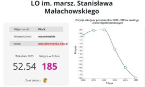 Małachowianka, chociaż z niemałym spadkiem, wciąż pozostaje najlepsza wśród płockich liceów. Przyznano jej 185. lokatę w rankingu ogólnokrajowym (dla porównania w 2024 r. – 166, w 2023 r. – 133, w 2022 r. – 98).
