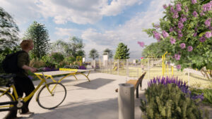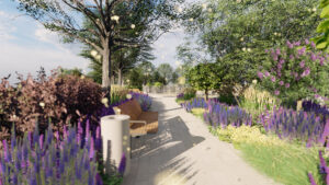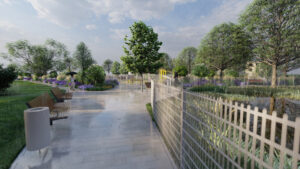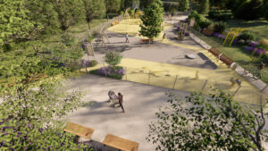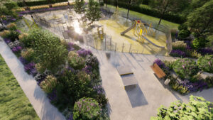 Urządzenie terenu wymaga również ułożenia nowych nawierzchni (te zostaną wykonane z betonowej kostki) i wykorzystania elementów małej architektury, w tym uzupełnienia zaaranżowanych alejek m.in. o stojaki na rowery, ławeczki z oparciami i kosze na śmieci.