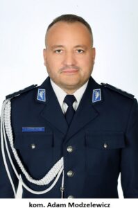 Kom. Adam Modzelewicz służbę pełni w Policji od 2011 roku. Jest absolwentem Uniwersytetu Mikołaja Kopernika w Toruniu. Wiedzę i doświadczenie zdobywał służąc w pionie kryminalnym. Doświadczenie zawodowe na stanowiskach kierowniczych zdobywał jako pierwszy zastępca komendanta powiatowego policji w Sochaczewie oraz pierwszy zastępca komendanta powiatowego policji w Gostyninie.