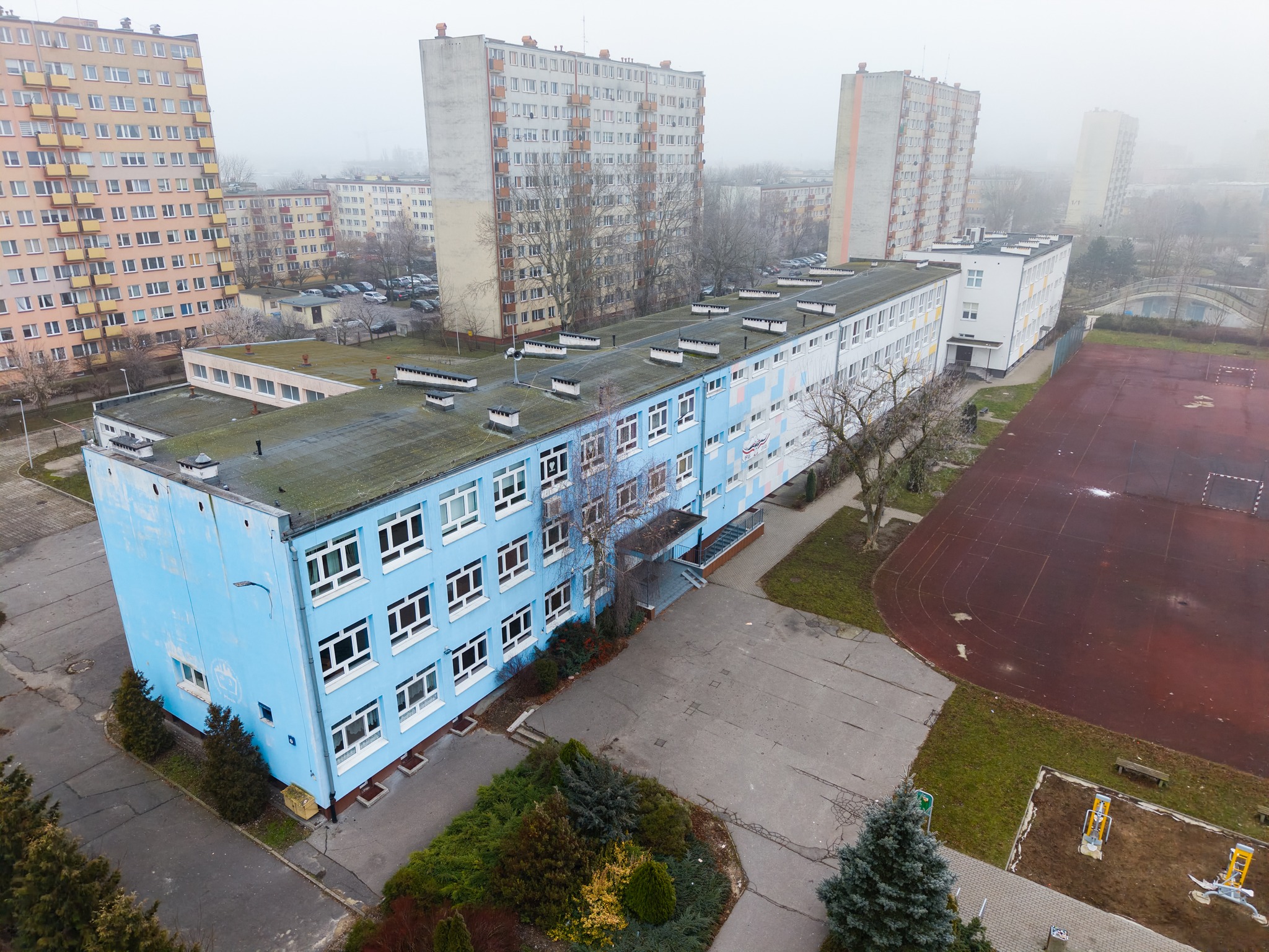 Zmieni się również zagospodarowanie terenu wokół budynku, począwszy od usunięcia dotychczasowego wyposażenia boisk i przeniesienia urządzeń z siłowni pod chmurką. Powstanie plac zabaw dostosowany do potrzeb młodszych dzieci. Ponadto po stronie zachodniej powstaną parkingi dla samochodów osobowych użytkowników żłobka i korzystających z najwyższego piętra budynku. Z kolei po stronie wschodnie zaplanowano budowę tarasu do leżakowania dla maluchów.
